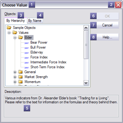 1 - Caption - Describes the object type being chosen. 2 - Close Button - Closes the form canceling choosing an object. 3 - By Hierarchy - Displays a tree of available named objects as they appear in the object library. Only objects of the allowed type and style are displayed. Navigating the object tree is identical to navigating the object manager object tree. 4 - By Name - Displays an alphabetical list of available named objects. Duplicate names will appear with their parent group names to help differentiate the objects. Only objects of the allowed type and style are displayed. 5 - Description - Description of currently selected object. 6 - OK Button - Closes the form updating the object reference to the selected object. If a valid object is not selected, the button is not available. 7 - Cancel Button - Closes the form canceling choosing an object. 8 - Help Button - Launches the application help system displaying this help topic.